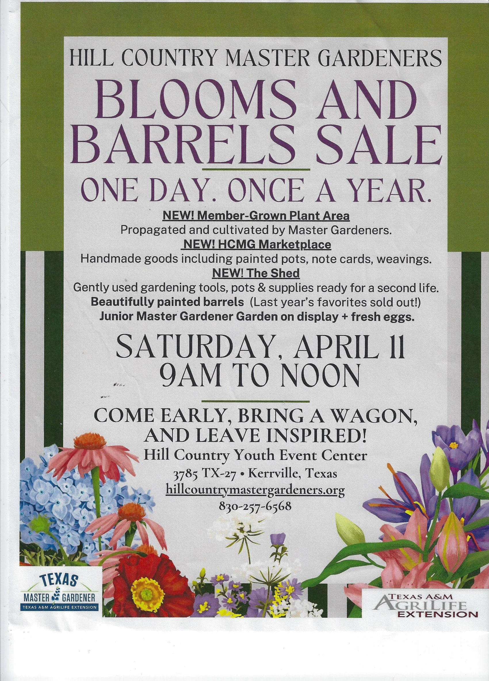 Mark your calendar for April 11 at 9 am and come see what’s blooming. Hill Country Youth Event Center (AgBarn) 3785 Hwy 27, Kerrville Texas
